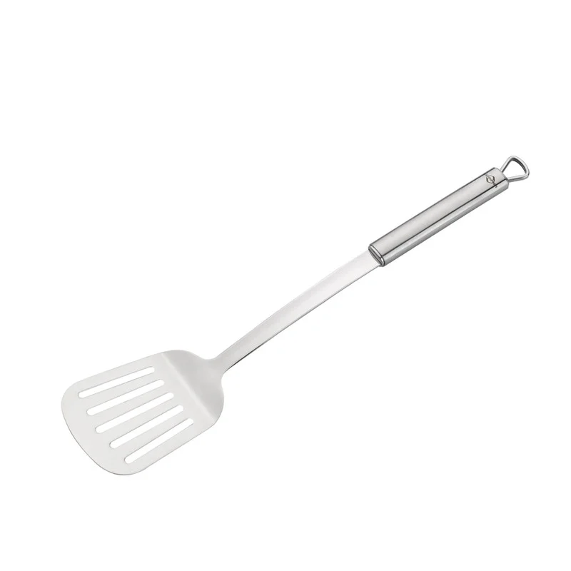 Η σπάτουλα της σειράς Parma της Kuchenprofi είναι κατασκευασμένη από υψηλής ποιότητας ανοξείδωτο ατσάλι 18/10, προσφέροντας ανθεκτικότητα και μακροχρόνια χρήση. Με μήκος 13,5 ιντσών, διαθέτει εργονομική λαβή τριγωνικού σχήματος για άνετο και ασφαλές κράτημα. Η λεπτή και ελαφρώς κεκλιμένη άκρη της επιτρέπει την εύκολη εισχώρηση κάτω από ευαίσθητα τρόφιμα όπως αυγά ή ψάρια, ενώ οι μακριές σχισμές μειώνουν την επιφάνεια επαφής, αποτρέποντας την προσκόλληση των τροφίμων. Είναι κατάλληλη για πλύσιμο στο πλυντήριο πιάτων και διαθέτει θηλιά για εύκολη αποθήκευση.