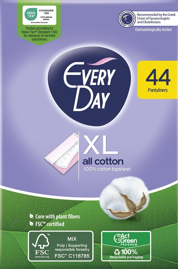 Τα Every Day All Cotton Extra Long είναι σερβιετάκια με 100% βαμβακερό κάλυμμα, προσφέροντας μοναδική αίσθηση απαλότητας και υγιεινής προστασίας. Είναι 15% μεγαλύτερα σε μήκος και πλάτος σε σχέση με τα κανονικά σερβιετάκια, εξασφαλίζοντας άνεση και ασφάλεια καθ’ όλη τη διάρκεια της ημέρας. Διαθέτουν πυρήνα από ίνες φυτικής προέλευσης με πιστοποίηση FSC™ και είναι δερματολογικά ελεγμένα. Παράγονται στην Ελλάδα και είναι τα πρώτα στην Ευρώπη με πιστοποίηση OEKO-TEX® STANDARD 100 για απουσία βλαβερών ουσιών.