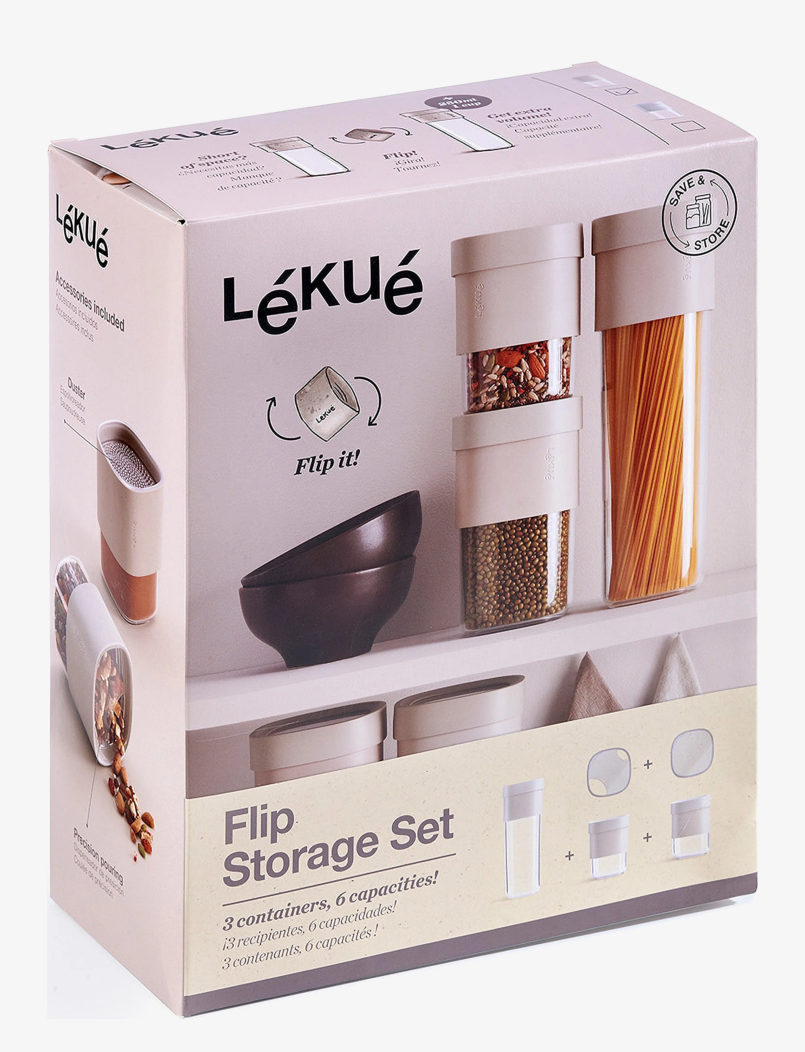 Το Lekué Flip Storage σετ δοχείων αποθήκευσης σε ασημί χρώμα αποτελεί ένα ευέλικτο και πρακτικό σύστημα για την οργάνωση της κουζίνας σας. Το σετ περιλαμβάνει τρία δοχεία με έξι διαφορετικές χωρητικότητες, προσαρμόζοντας τον όγκο τους από 600ml σε 850ml και από 1350ml σε 1600ml, προσφέροντας μια επιπλέον χωρητικότητα 250ml όταν χρειάζεται. Συγκεκριμένα, περιλαμβάνει ένα Flip Storage L, δύο Flip Storage M και δύο αξεσουάρ Flip Storage. Κατασκευασμένα από ρητίνη στυρενίου-ακρυλονιτριλίου, πολυπροπυλένιο και πλατινένια σιλικόνη, τα δοχεία είναι ιδανικά για την αποθήκευση τροφίμων όπως αλάτι, ξηροί καρποί, ζυμαρικά και δημητριακά. Με ύψος 26.5cm, πλάτος 10.5cm και μήκος 21cm, ο διαφανής σχεδιασμός τους, τόσο στο δοχείο όσο και στο καπάκι, διατηρεί το περιεχόμενο ορατό από κάθε θέση, διευκολύνοντας την οργάνωση των συρταριών και των ντουλαπιών της κουζίνας.