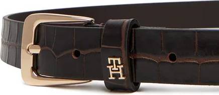 Αυτή η γυναικεία ζώνη από την Tommy Hilfiger διακρίνεται για το κομψό και διαχρονικό της στυλ, προσθέτοντας μια αυθεντική και πολυτελή πινελιά σε κάθε εμφάνιση. Το μοντέλο είναι κατασκευασμένο από 100% δέρμα με εντυπωσιακό ανάγλυφο croco-print, το οποίο προσδίδει μια αίσθηση πολυτέλειας και κομψότητας. Η ζώνη διαθέτει τετράγωνη, γυαλιστερή μεταλλική αγκράφα σε χρυσό χρώμα (ή άλλο γυαλιστερό μέταλλο), η οποία κοσμείται με διακριτική πλακέτα με το μονόγραμμα TH, ενώ το πλάτος της στα 2,5 cm την καθιστά ένα μικρό και διακριτικό αξεσουάρ. Το πλούσιο καφέ χρώμα (Rich Walnut) την καθιστά εύκολα συνδυάσιμη με πολλά ρούχα, ιδανική για καθημερινές αλλά και πιο επίσημες περιστάσεις, εξασφαλίζοντας πάντα μια άψογη εφαρμογή.