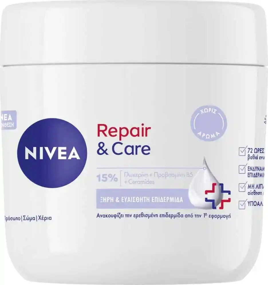 Η Nivea Repair & Care Sensitive Cream είναι μια εξειδικευμένη κρέμα σώματος που έχει σχεδιαστεί για να καλύπτει τις ανάγκες της πολύ ξηρής και ευαίσθητης επιδερμίδας προσφέροντας ανακούφιση που διαρκεί έως και 72 ώρες. Η σύνθεσή της περιέχει D-Panthenol και το Deep Moisture Serum της Nivea τα οποία συνεργάζονται για να ενισχύσουν τον προστατευτικό φραγμό του δέρματος και να κλειδώσουν την υγρασία στα βαθύτερα στρώματα. Βοηθά στην άμεση μείωση της αίσθησης τραβήγματος και του κνησμού που συχνά συνοδεύουν το ξηρό δέρμα αφήνοντας μια αίσθηση απόλυτης άνεσης και απαλότητας. Χωρίς άρωμα και οινόπνευμα είναι εξαιρετικά φιλική προς το δέρμα ελαχιστοποιώντας τον κίνδυνο εμφάνισης ερεθισμών ή αλλεργικών αντιδράσεων. Η τακτική εφαρμογή της μεταμορφώνει την τραχιά επιδερμίδα σε λεία και υγιή προσφέροντας μια ολοκληρωμένη φροντίδα επανόρθωσης που αντέχει στον χρόνο.