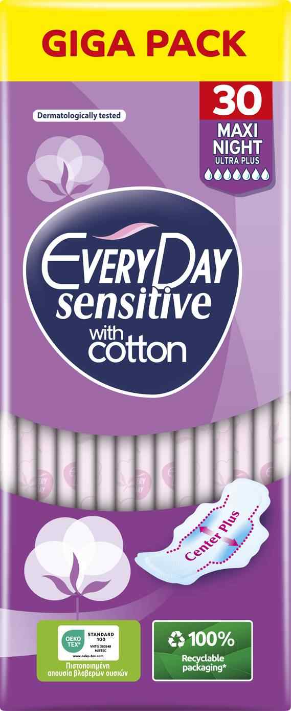 Συνδυάζοντας την απαλότητα της σειράς Sensitive με την προστασία νυκτός Maxi Night αυτό το Giga Pack των 30 τεμαχίων είναι η απόλυτη λύση για τον ύπνο. Προσφέρουν μέγιστη κάλυψη και απορροφητικότητα ενώ το φιλικό προς το δέρμα κάλυμμα εξασφαλίζει ότι δεν θα υπάρξουν ερεθισμοί. Τα φτερά κρατούν τη σερβιέτα σταθερή σε κάθε κίνηση προσφέροντας ασφάλεια καθ' όλη τη διάρκεια της νύχτας. Η μεγάλη συσκευασία είναι εξαιρετικά πρακτική και οικονομική καλύπτοντας τις ανάγκες σας για μεγάλο χρονικό διάστημα. Με την Every Day μπορείτε να απολαμβάνετε έναν ήσυχο ύπνο με την καλύτερη δυνατή προστασία.
