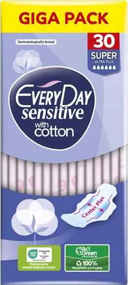 Το Giga Pack των 30 τεμαχίων προσφέρει την αγαπημένη προστασία Every Day Ultra Plus Sensitive Super σε μια πολύ οικονομική συσκευασία. Οι σερβιέτες αυτές είναι σχεδιασμένες για μεγάλη ροή και διαθέτουν ένα εξαιρετικά απαλό κάλυμμα που προστατεύει το δέρμα από ερεθισμούς. Η τεχνολογία Center Plus κλειδώνει την υγρασία στο κέντρο ενώ τα φτερά εμποδίζουν τις πλαϊνές διαρροές. Είναι η ιδανική επιλογή για όσες θέλουν να έχουν πάντα διαθέσιμο ένα μεγάλο απόθεμα προστασίας υψηλής ποιότητας. Με το Giga Pack εξασφαλίζετε άνεση και σιγουριά για πολλούς κύκλους περιόδου.