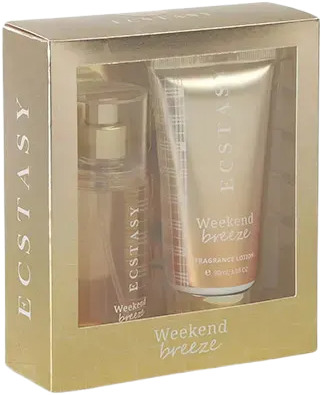 Το Weekend Breeze Σετ Δώρου της Ecstasy είναι αφιερωμένο στη χαλάρωση και την αναζωογόνηση, περιλαμβάνοντας Body Mist και Body Cream 90ml, που χωρούν εύκολα σε κάθε τσάντα ταξιδιού ή καθημερινής χρήσης. Το άρωμα «Weekend Breeze» είναι ένα αέρινο, δροσερό και ελαφρύ άρωμα, που συνήθως θυμίζει θαλασσινή αύρα, φρεσκοκομμένα λουλούδια και εσπεριδοειδή, ξυπνώντας εικόνες από μια ξέγνοιαστη απόδραση. Η σύνθεση της ενυδατικής κρέμας είναι πλούσια αλλά απορροφάται γρήγορα, προσφέροντας την απαραίτητη ενυδάτωση στο σώμα χωρίς να αφήνει λιπαρότητα, ενώ παράλληλα προετοιμάζει το δέρμα για τον ψεκασμό του Body Mist. Με αυτόν τον συνδυασμό, το άρωμα αποκτά μεγαλύτερη διάρκεια και ένταση, χαρίζοντας μια αίσθηση καθαριότητας, δροσιάς και ευεξίας που είναι ιδανική για να σας συνοδεύει σε όλες τις στιγμές του Σαββατοκύριακου.