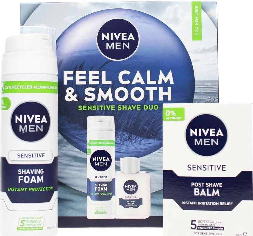 Το σετ Nivea Men Calm & Smooth αποτελεί το ιδανικό δίδυμο για ένα άνετο και χωρίς ερεθισμούς ξύρισμα. Περιλαμβάνει τον αφρό ξυρίσματος Sensitive (200ml) και το Post Shave Balm Sensitive (100ml), δύο προϊόντα που έχουν σχεδιαστεί για να προσφέρουν μέγιστη ανακούφιση στο δέρμα. Ο αφρός μαλακώνει τα γένια για ένα βαθύ και εύκολο ξύρισμα, ενώ το balm απορροφάται άμεσα για να καταπραΰνει την επιδερμίδα και να αποτρέψει το "κάψιμο" του ξυραφιού. Χωρίς οινόπνευμα και με σύνθεση που σέβεται την ευαίσθητη επιδερμίδα, αυτό το σετ είναι η βασική ρουτίνα που κάθε άνδρας χρειάζεται για να διατηρεί το πρόσωπό του απαλό και περιποιημένο με τον πιο απλό τρόπο.