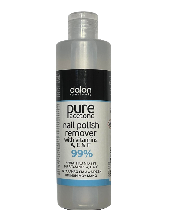 Το Dalon Καθαρό Ασετόν Νυχιών είναι ένα εξαιρετικά αποτελεσματικό αφαιρετικό βερνικιού, σχεδιασμένο για να αφαιρεί γρήγορα και εύκολα κάθε τύπο βερνικιού, συμπεριλαμβανομένου και του ημιμόνιμου. Η σύνθεσή του είναι ενισχυμένη με τις βιταμίνες Α, Ε και F, οι οποίες συμβάλλουν στη θρέψη και την προστασία των νυχιών και του περιβάλλοντος δέρματος κατά τη διάρκεια της διαδικασίας αφαίρεσης. Για τη χρήση του, εμποτίζετε ένα κομμάτι βαμβάκι με μικρή ποσότητα του προϊόντος, τοποθετείτε το βαμβάκι πάνω στο νύχι για μερικά δευτερόλεπτα και στη συνέχεια τρίβετε απαλά μέχρι να αφαιρεθεί πλήρως το βερνίκι.