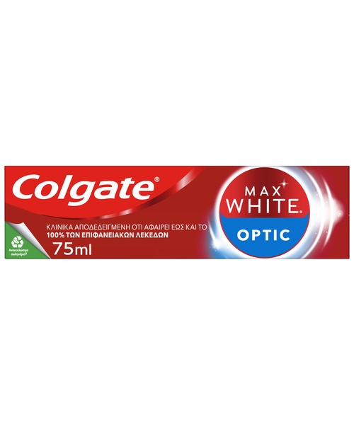 Η Colgate Max White Optic έχει ειδική σύνθεση με οπτικό λευκαντικό εφέ που φωτίζει άμεσα τα δόντια, παράλληλα με καθημερινή λευκαντική δράση. Η λεπτή υφή της καθαρίζει τα δόντια με στοχευμένο τρόπο, ενώ τα οπτικά συστατικά προσφέρουν άμεσα πιο φωτεινό αποτέλεσµα στην εμφάνιση του χαμόγελου.
