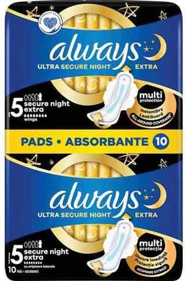 Οι Always Ultra Secure Night Extra Size 5 αποτελούν τη μεγαλύτερη και πιο απορροφητική επιλογή στη σειρά Ultra, προσφέροντας την απόλυτη ασφάλεια για τις πιο δύσκολες νύχτες. Με το μεγαλύτερο δυνατό μήκος και πλάτος στο πίσω μέρος, αυτές οι σερβιέτες εγγυώνται μηδενικές διαρροές ανεξάρτητα από τη στάση του ύπνου ή την ένταση της ροής. Η προηγμένη τεχνολογία InstantDry απομακρύνει τα υγρά ακαριαία από την επιφάνεια, ενώ ο πυρήνας τα μετατρέπει σε τζελ για μέγιστη στεγνότητα. Η τεχνολογία εξουδετέρωσης οσμών προσφέρει διαρκή καθαριότητα, ενώ τα ειδικά φτερά κρατούν τη σερβιέτα ακλόνητη. Είναι δερματολογικά ελεγμένες και σχεδιασμένες να προσφέρουν άνεση χωρίς να ερεθίζουν το δέρμα. Η συσκευασία των 10 τεμαχίων είναι ιδανική για τις ημέρες με την πιο έντονη ροή του κύκλου, παρέχοντας την κορυφαία προστασία Always που εμπνέει απόλυτη εμπιστοσύνη για έναν ήσυχο ύπνο.