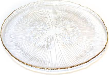 Η γυάλινη πιατέλα διαμέτρου 21 cm με ανάγλυφη υφή και χρυσό χείλος προσθέτει μια αίσθηση κομψότητας και φινέτσας στο τραπέζι σας. Το ανάγλυφο μοτίβο στο γυαλί προσδίδει διακριτική υφή και χαρακτήρα, ενώ το χρυσό χείλος δημιουργεί μια διακριτική αλλά πολυτελή αντίθεση που αναδεικνύει τα εδέσματά σας. Η σχεδίαση είναι ιδανική για ιδιαίτερες περιστάσεις ή γιορτινά τραπέζια, μετατρέποντας την παρουσίαση φαγητού ή επιδορπίου σε μια πιο κομψή εμπειρία. Η πιατέλα μπορεί να χρησιμοποιηθεί για σερβίρισμα γλυκών, ορεκτικών ή μικρών πιάτων, προσφέροντας ταυτόχρονα αισθητική που ταιριάζει και σε πιο επίσημες όσο και πιο casual περιστάσεις.