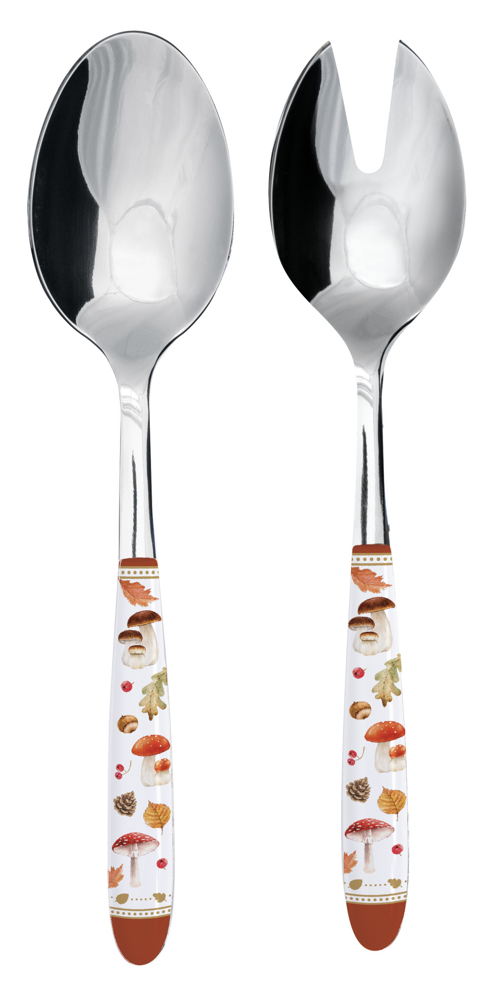Το Forest Breeze Σετ 2 Τεμαχίων Σερβιρίσματος Σαλάτας Autumn Breeze είναι κατασκευασμένο από ανοξείδωτο ατσάλι με πλαστική λαβή διακοσμημένη, και φέρνει την ουσία του δάσους στο τραπέζι σας, δημιουργώντας μια φυσική και γοητευτική ατμόσφαιρα. Κάθε κομμάτι παραπέμπει στην ηρεμία και το μυστήριο της φύσης, ιδανικό για να δημιουργήσετε ένα χαλαρωτικό και φιλόξενο περιβάλλον. Οι προσεκτικά σχεδιασμένες απεικονίσεις με φύλλα, κλαδιά και πολύχρωμα μανιτάρια αναπαράγουν πιστά τις λεπτομέρειες του δασικού τοπίου, συμπληρώνοντας το design με γήινες αποχρώσεις, πράσινο και διακριτικές πινελιές κόκκινου και καφέ. Η συλλογή Forest Breeze είναι ιδανική για τους λάτρεις της φύσης και της ρουστίκ απλότητας, προσθέτοντας μια νότα φρεσκάδας και αυθεντικότητας στην καθημερινή διακόσμηση ή σε ειδικές περιστάσεις, για μια στιγμή απόδρασης σε ένα φυσικό τοπίο.