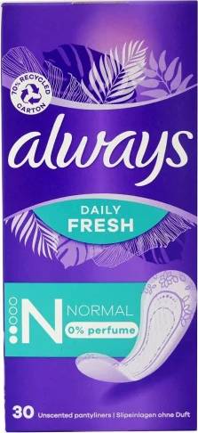 Τα σερβιετάκια Always Daily Fresh Normal έχουν δημιουργηθεί για να προσφέρουν έναν ιδανικό συνδυασμό άνεσης και καθημερινής προστασίας, διατηρώντας σας φρέσκια και καθαρή καθ' όλη τη διάρκεια της ημέρας. Το άνετο και διακριτικό τους σχέδιο εξασφαλίζει ότι μπορείτε να βασίζεστε σε αυτά καθημερινά χωρίς να τα αισθάνεστε, ενώ ο απορροφητικός πυρήνας τους εγκλωβίζει την υγρασία για μια συνεχή αίσθηση στεγνότητας. Η φόρμουλα τους είναι 0% άρωμα, καθιστώντας τα κατάλληλα για γυναίκες που προτιμούν προϊόντα χωρίς πρόσθετα αρώματα, και είναι δερματολογικά εγκεκριμένα από τη Skin Health Alliance. Παρέχουν αξιόπιστη προστασία από τις κολπικές εκκρίσεις, λειτουργούν ως επιπλέον ασφάλεια σε περίπτωση ακανόνιστης ή ελαφριάς ροής της περιόδου, ενώ είναι κατάλληλα και για την αντιμετώπιση της ελαφριάς ακράτειας.