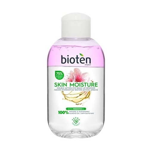 Η Λοσιόν Ντεμακιγιάζ Ματιών Διπλής Δράσης Bioten είναι εμπλουτισμένη με 100% φυσικό έλαιο Αμυγδάλου που προστατεύει τις βλεφαρίδες και το ευαίσθητο δέρμα γύρω από τα μάτια.