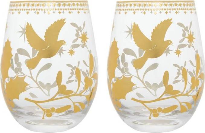 Maxwell & Williams White Christmas Stemless Wine Glasses 550ml Glass Set of 2 - Gold
