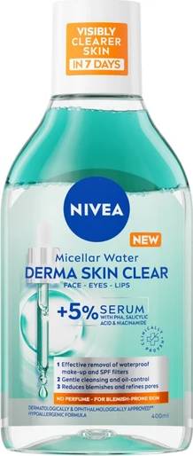 Το Nivea Derma Skin Clear Micellar Water Νερό Καθαρισμού Προσώπου 400ml είναι ένα αποτελεσματικό νερό micellar που καθαρίζει σε βάθος και αντιμετωπίζει τις ατέλειες της επιδερμίδας με τάση για ακμή. Η φόρμουλά του βασίζεται στην τεχνολογία micellar, η οποία λειτουργεί σαν μαγνήτης, προσελκύοντας και απομακρύνοντας αποτελεσματικά το μακιγιάζ, τους ρύπους και τη λιπαρότητα από το πρόσωπο και τα μάτια, χωρίς να απαιτείται τρίψιμο ή ξέβγαλμα. Είναι εμπλουτισμένο με σαλικυλικό οξύ και νιασιναμίδιο, ενεργά συστατικά που βοηθούν στην απολέπιση των νεκρών κυττάρων, τον καθαρισμό των φραγμένων πόρων και τη μείωση της εμφάνισης ατελειών. Το προϊόν δεν περιέχει οινόπνευμα, είναι δερματολογικά ελεγμένο και μη φαγεσωρογόνο, καθιστώντας το κατάλληλο για λιπαρές, μεικτές και με τάση ακμής επιδερμίδες. Προσφέρει βαθύ καθαρισμό, τονώνει και ενυδατώνει διακριτικά, προετοιμάζοντας το δέρμα για την επόμενη φροντίδα.