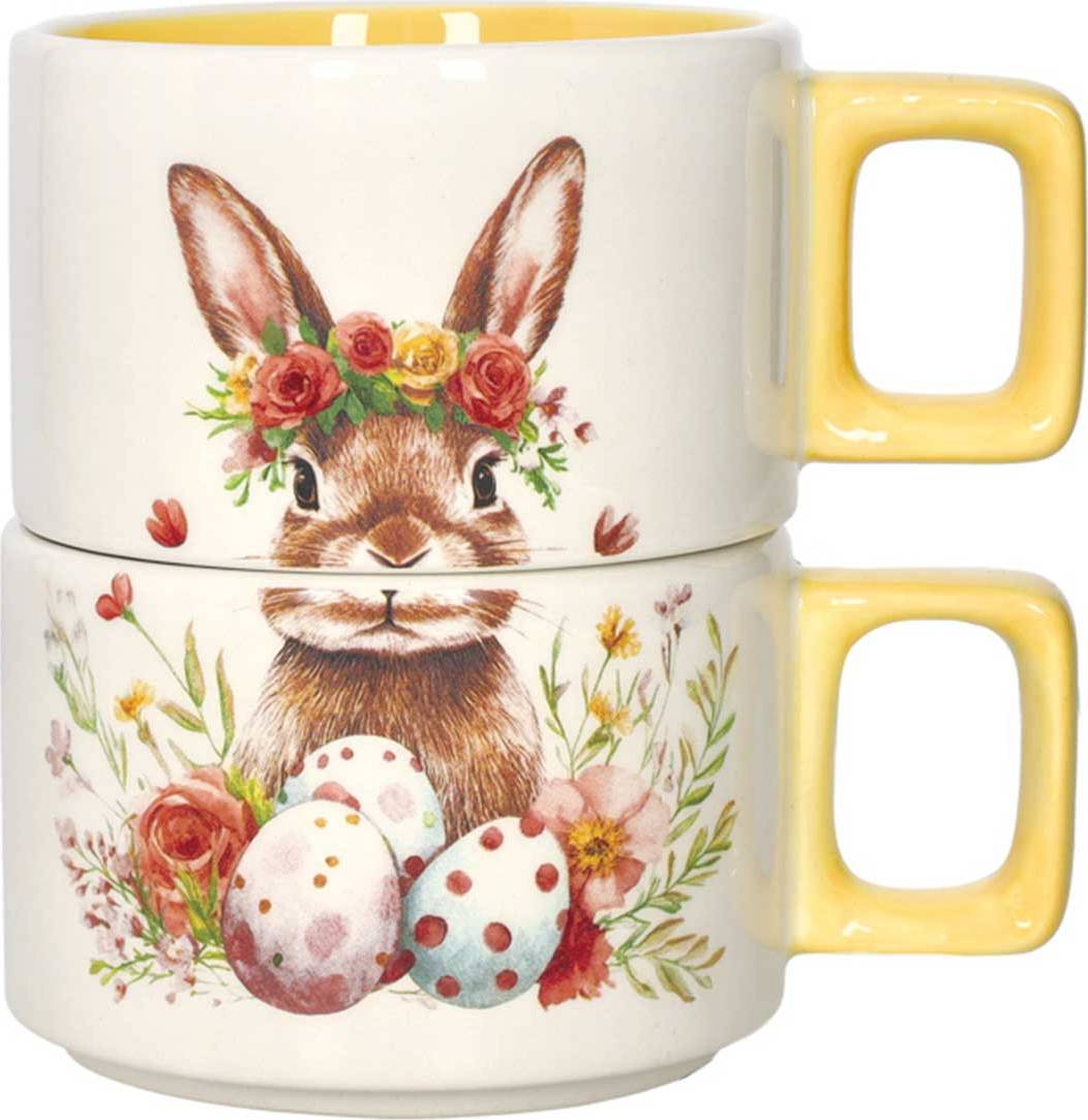 Αυτό το κομψό σετ δύο τεμαχίων από τη συλλογή Sweet Bunny της Brandani είναι κατασκευασμένο από υψηλής ποιότητας κεραμικό υλικό (dolomite) και διαθέτει έναν έξυπνο σχεδιασμό που επιτρέπει στις κούπες να στοιβάζονται η μία πάνω στην άλλη για εξοικονόμηση χώρου. Με διαστάσεις 9.5 x 9.5 x 6.5 cm και χωρητικότητα 300ml, οι κούπες αναδεικνύονται από το φωτεινό κίτρινο εσωτερικό τους και τις χαριτωμένες παραστάσεις με κουνελάκια και λουλούδια, αποτελώντας ένα τρυφερό αξεσουάρ για το πρωινό ή τις στιγμές χαλάρωσης που προσδίδει μια πολυτελή ανοιξιάτικη αίσθηση στην κουζίνα σας καθ' όλη τη διάρκεια του έτους.